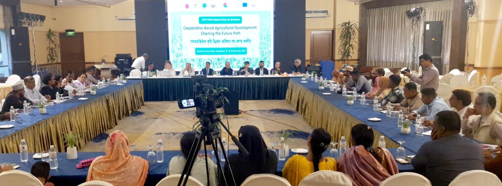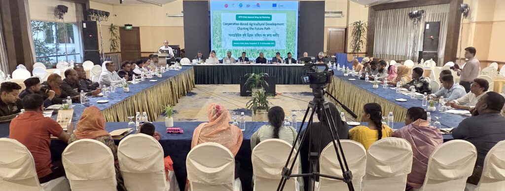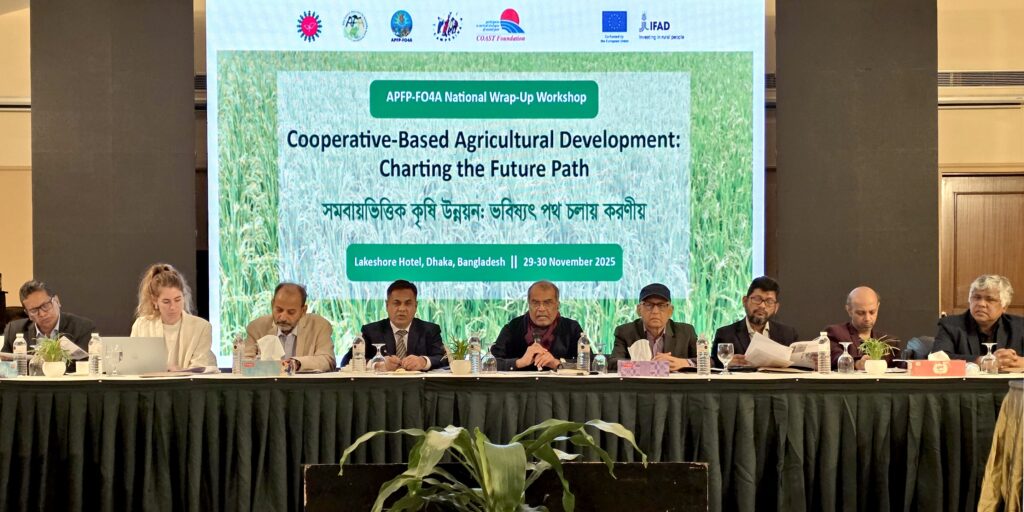 Dhaka, Bangladesh – COAST Foundation, the national implementing agency of APFP-FO4A in Bangladesh, successfully held a national-level wrap-up workshop on 29–30 November 2025 at the Lakeshore Hotel, Dhaka. The event marked five years of cooperative-based agricultural development under the APFP-FO4A program. The workshop brought together government officials, academia, development partners, and farmer organizations (FOs) to review progress, share insights, and discuss strategies for sustaining and scaling support for small-scale farmers across Bangladesh.