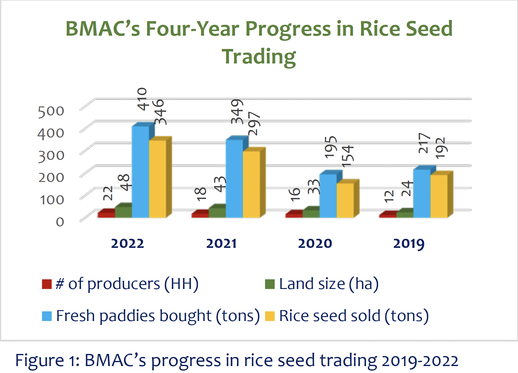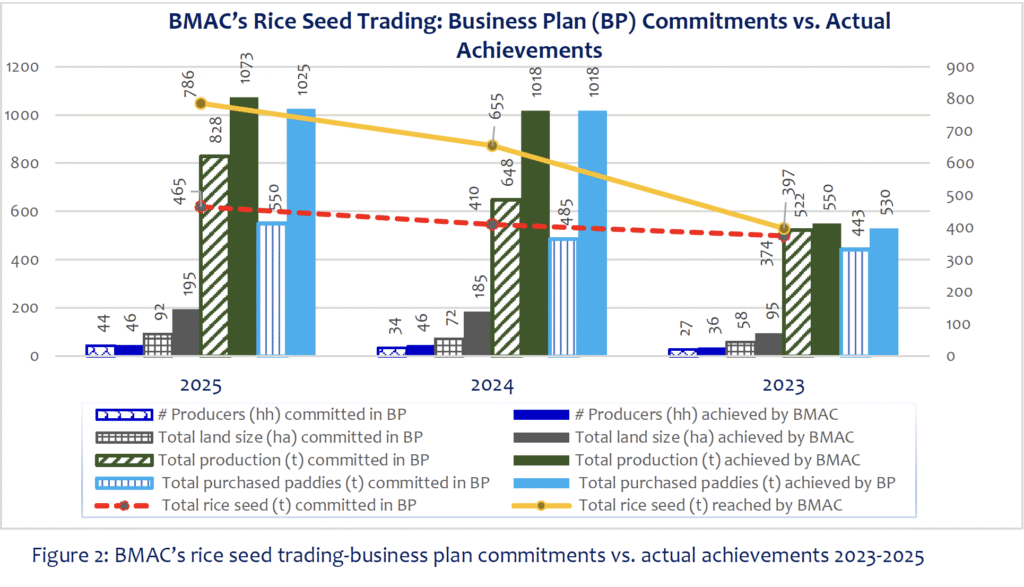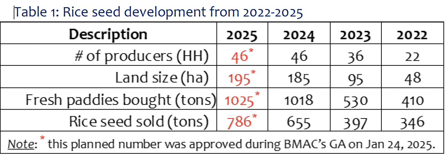 With clear guidance from its business plan, BMAC’s rice seed trading operations surpassed expectations. In 2023, the plan targeted 27 rice producer households but achieved 36; in 2024, the target was 34 but reached 46. Rice seed production also exceeded goals: 374 tons planned and 397 tons achieved in 2023, and 410 tons planned versus 655 tons produced in 2024.