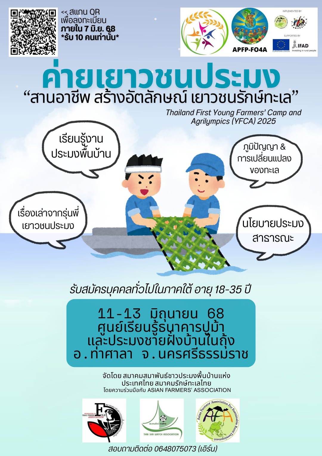 The First Thailand Young Farmers Camp and Agrilympics (YFCA), held on June 11–13, 2025 at the Blue Swimming Crab Bank and Coastal Fisheries Learning Center in Nakhon Si Thammarat, brought together youth from 14 southern provinces of Thailand (Krabi, Chumphon, Trang, Nakhon Si Thammarat, Narathiwat, Pattani, Phang Nga, Phatthalung, Phuket, Yala, Ranong, Songkhla, Satun, and Surat Thani). Under the theme “Nurturing Livelihoods, Building Identity, Youth for the Sea,” the camp featured interactive sessions on small-scale fisheries, identity building, youth-led storytelling, community challenges, policy dialogue, and project design. The event also marked the beginning of the YFCA youth network. It was organized by the Federation of Thai Fisherfolk Associations (FTFA), with support from local and regional partners.