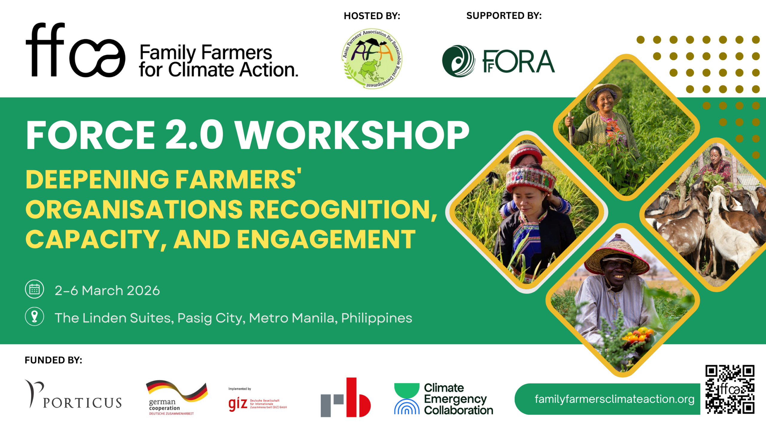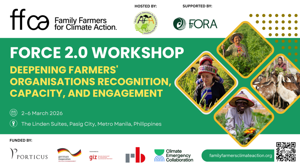The nine regional and two global farmers organisations (FOs) of the Family Farmers for Climate Action campaign are meeting for a workshop in Manila, Philippines, as a follow up of the 1st FORCE workshop in Tanzania (May 2025). The meeting, hosted by the Asian Farmers Association for Sustainable Rural Development (AFA), is organised with support of the Foundation for Farmers Organisations for Restorative Action (FFORA) and advice from the Global Strategic Communications Council (GSCC).